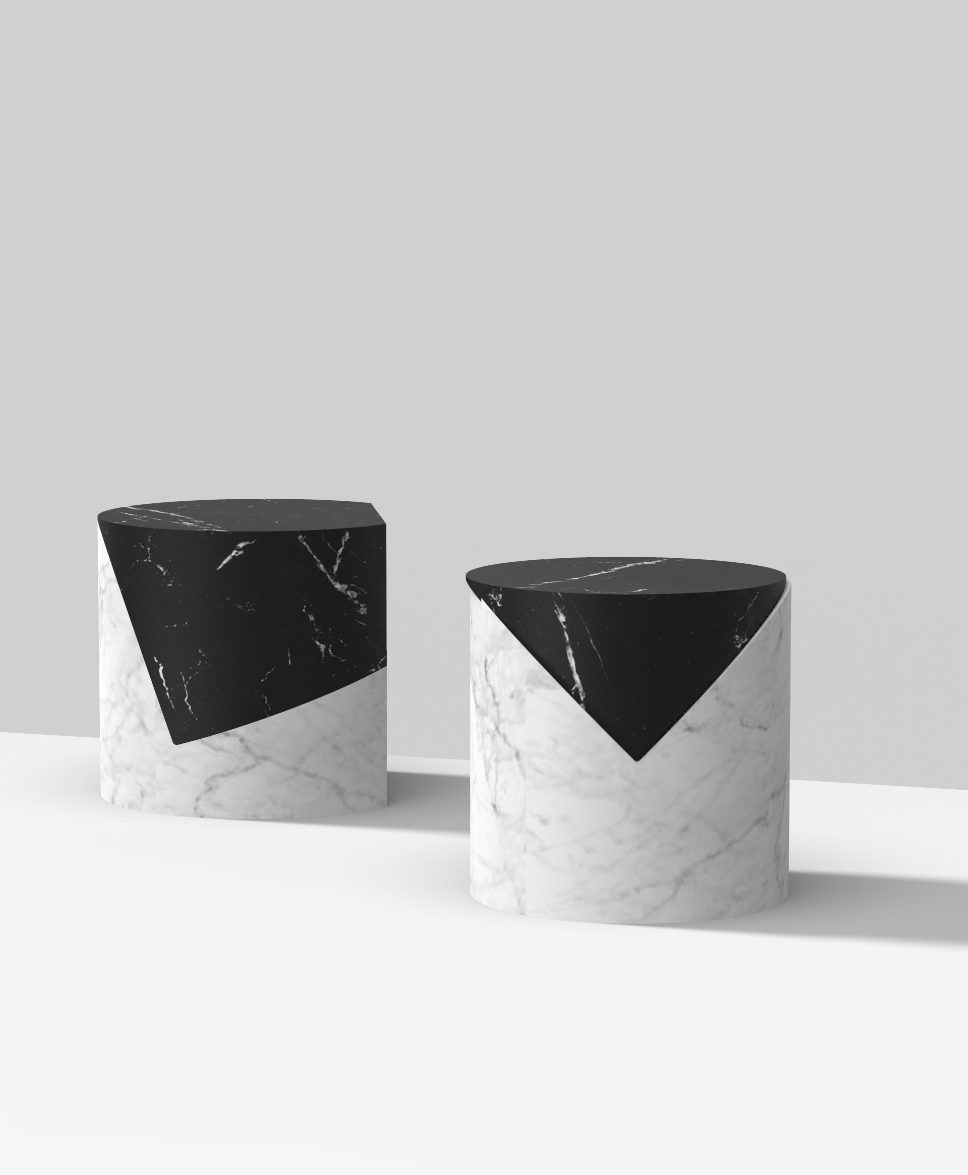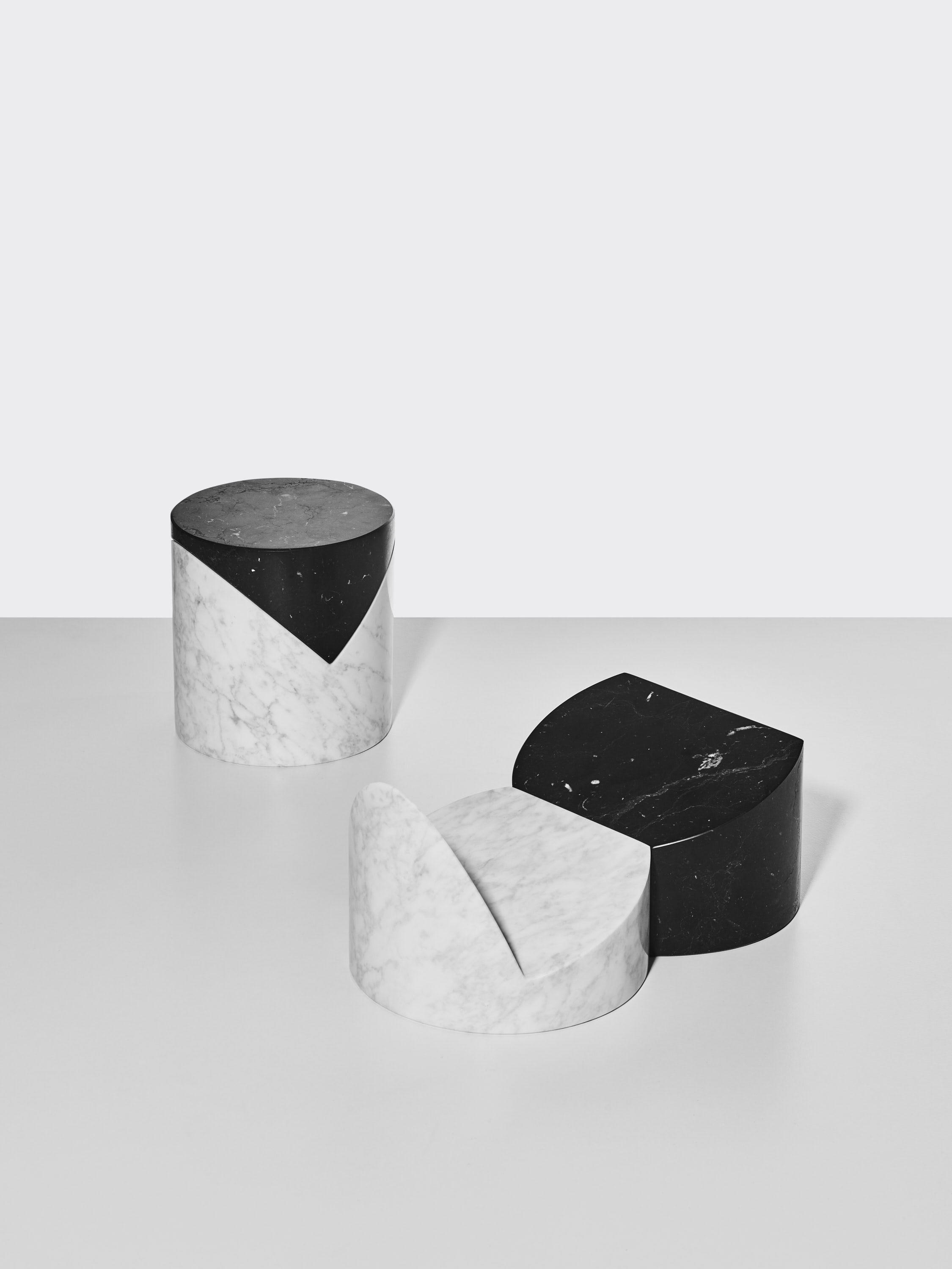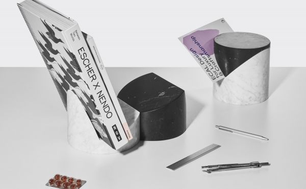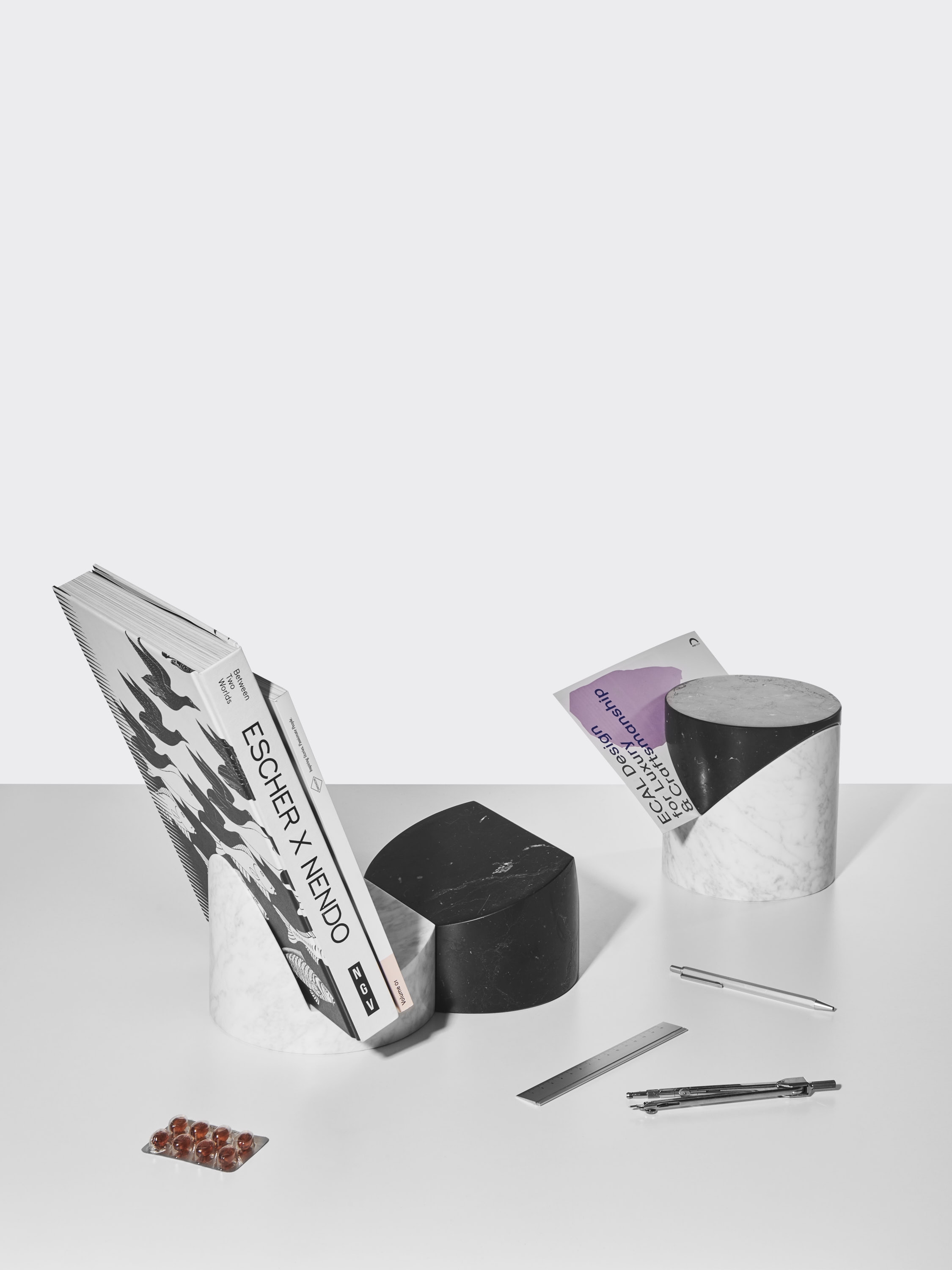 This bookend comprises two simple volumes that naturally fit into each other. The first element acts as a receptacle that can accommodate open or closed books, either in a herringbone fashion or stacked; while the second, thanks to the weight of the marble, keeps these sometimes risky compositions stable by sealing them like a cap.